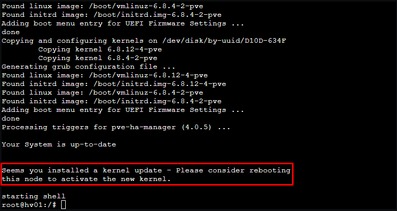 If you receive a warning about the kernel being updates, you must restart the server.