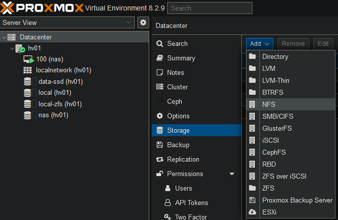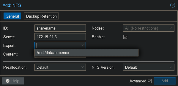 Set the name for Proxmox as the ID and enter the IP address of the server hosting the NFS share.