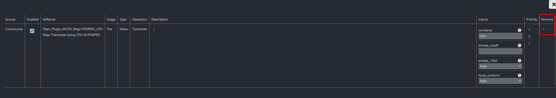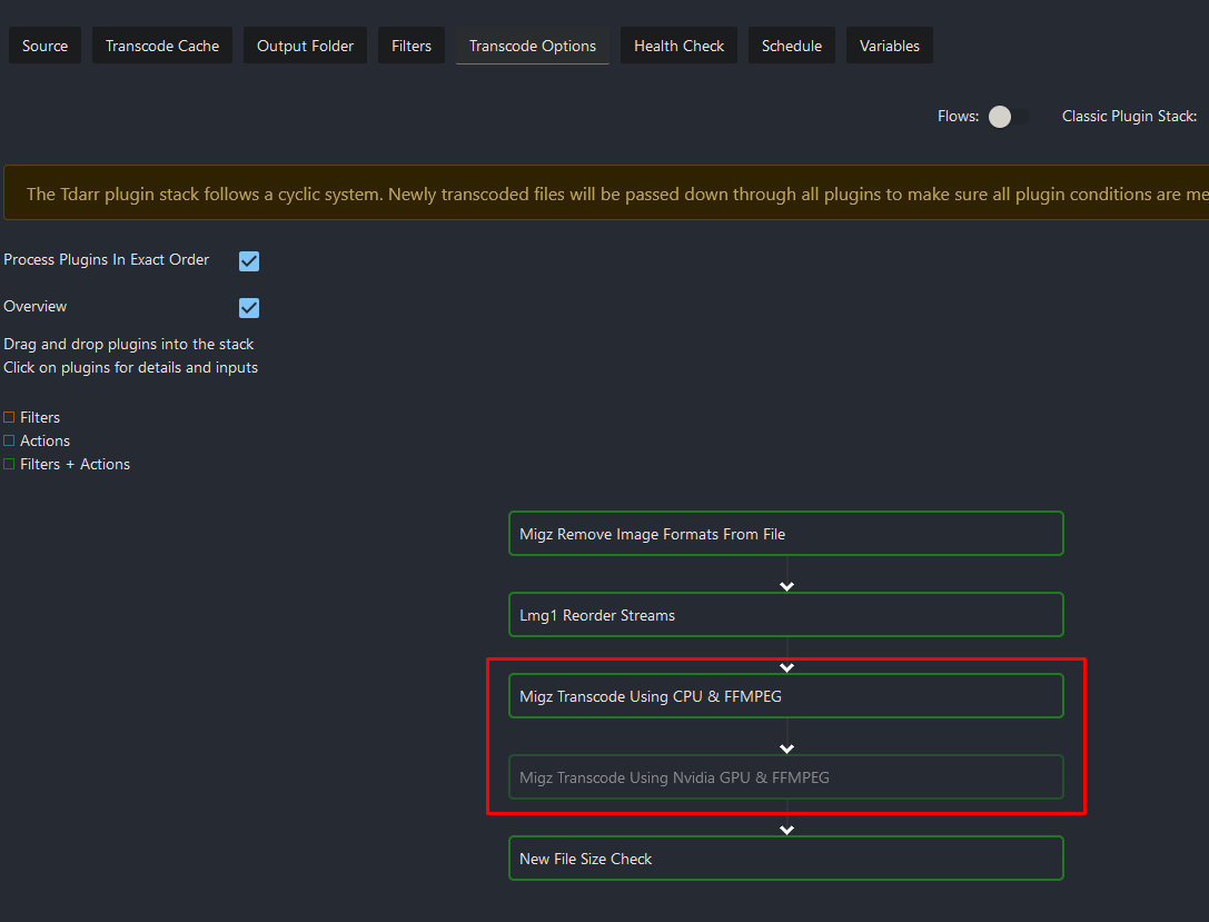 Select “Transcode Options” and delete these 2 plugins by clicking on them followed by the purple x.