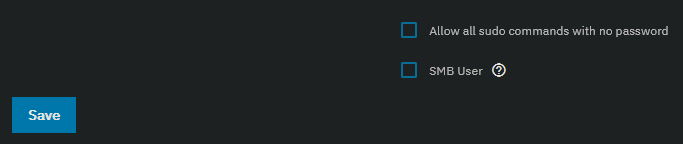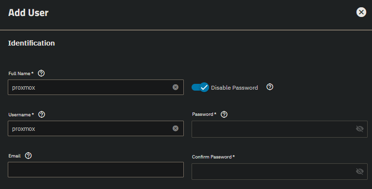 Fill in a username and disable the password. We will create a user proxmox for our proxmox NFS share which we will use later on as on the host for extra storage and LXC mount points.