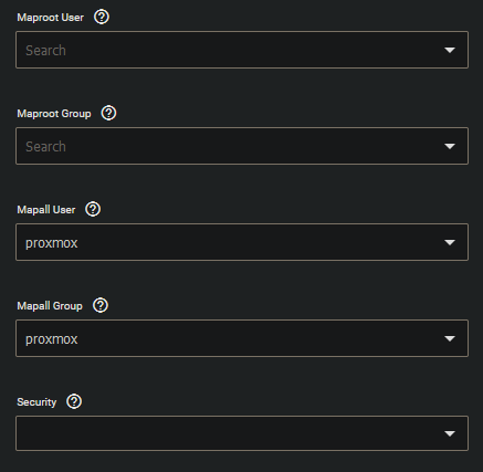 Under “Advanced Options” set the “Mapall user” and “Mapall group” to proxmox.