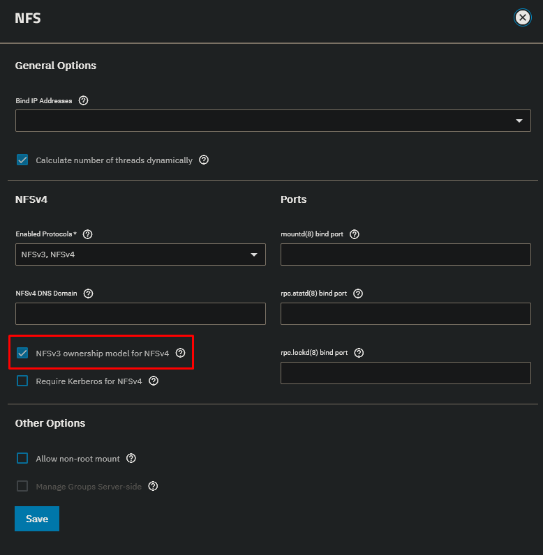 Edit the NFS service and enable “NFSv3 ownership model for NFSv4”. We will need this allow the docker containers to access the NFS share.