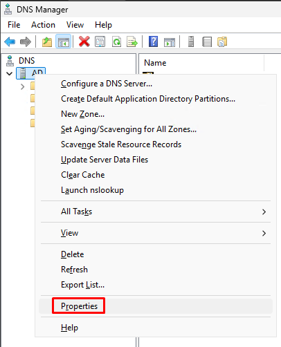 Open “DNS Manager”. Right lick on your server and select “Properties”.