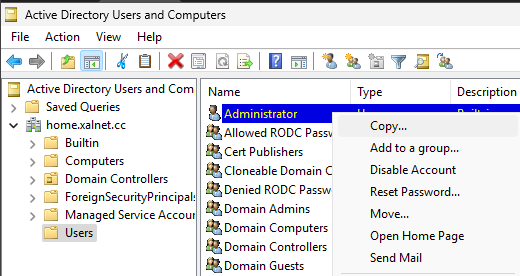Open “Active Directory Users and Computers”. Right click on Administrator and select “Copy”.