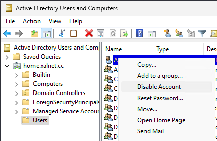 Logout of the server and log in with your new domain admin. Open “Active Users and Computers”. Right click on “Administrator” and select “Disable Account”.